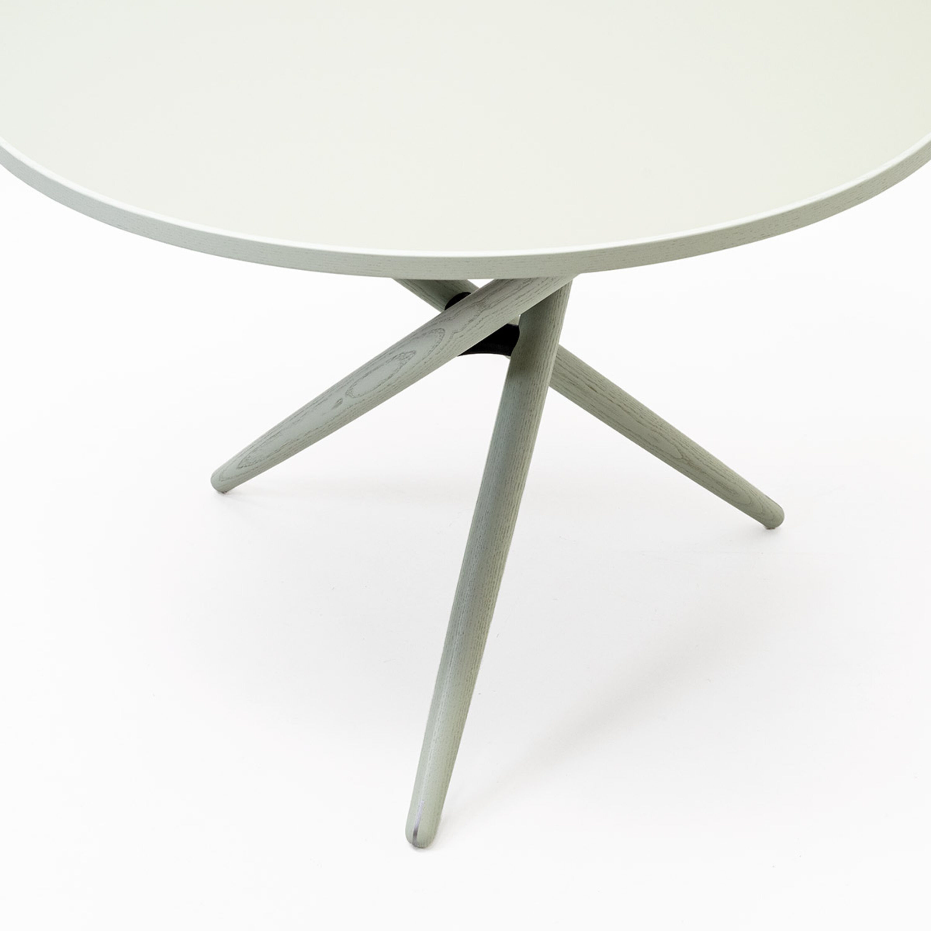 Tischblatt in Linoleum mit Massivholzkante, Durchmesser 95cm, Untergestell in Massivholz höhenverstellbar 42-74cm, zentrale Fussverbindung in Gusseisen anthrazitfarben, Verstellmechanik CNS