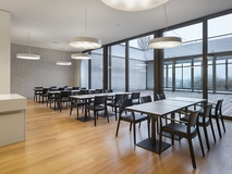 The Matura solid wooden chair with its warm minimalism continues the factual language of the horgenglarus collection into the 21st century. It is the comfortable evolution of the compact, straight miro chair. The bold sweeps of backrest and rear legs give distinction to its geometry. Thanks to a variety of seat widths, depths and heights as well as materials, the Matura is suited for a wide range of purposes and architectural styles. A staff canteen needs a different type of chair than a café, bistro, or fine-dining restaurant. A council chamber or boardroom makes other demands than a hotel room or a private dining room. Larger hotels, restaurants, or administrative offices often combine more than usage type in one building. Matura's end-to-end design line offers a large variety of functions. The seat's comfort level varies from wooden seat or cushion to very comfortable belt upholstery.